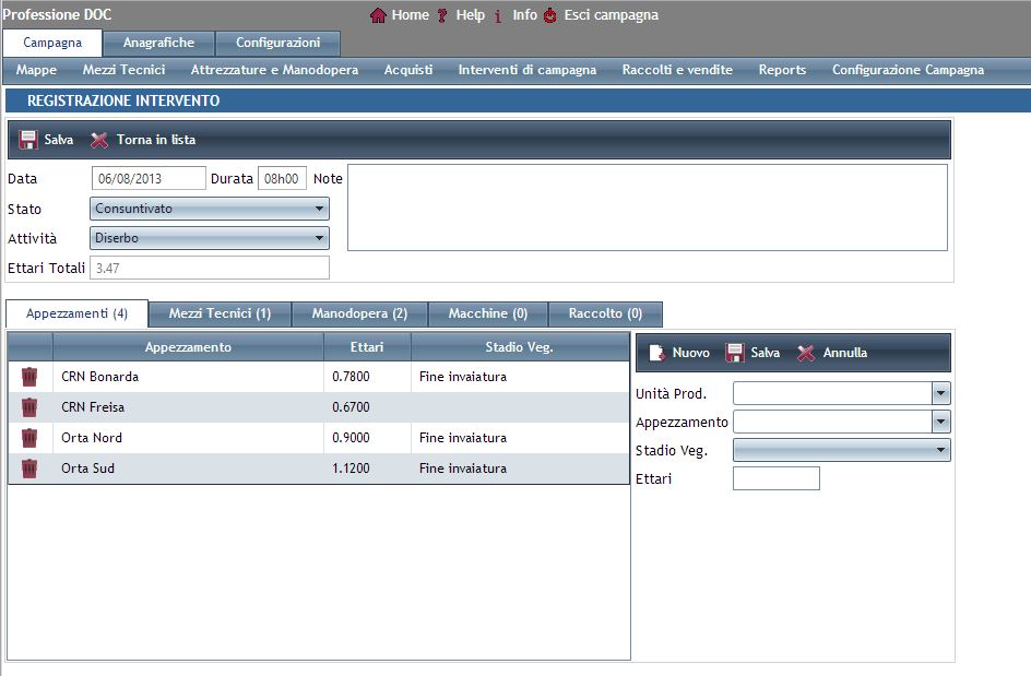 Professione DOC Wine permette di registrare, con estrema velocità e semplicità, le attività ed i trattamenti eseguiti in vigneto con l’indicazione degli appezzamenti coinvolti, dei fitofarmaci o fertilizzanti utilizzati, delle attrezzature e della manodopera impiegata.